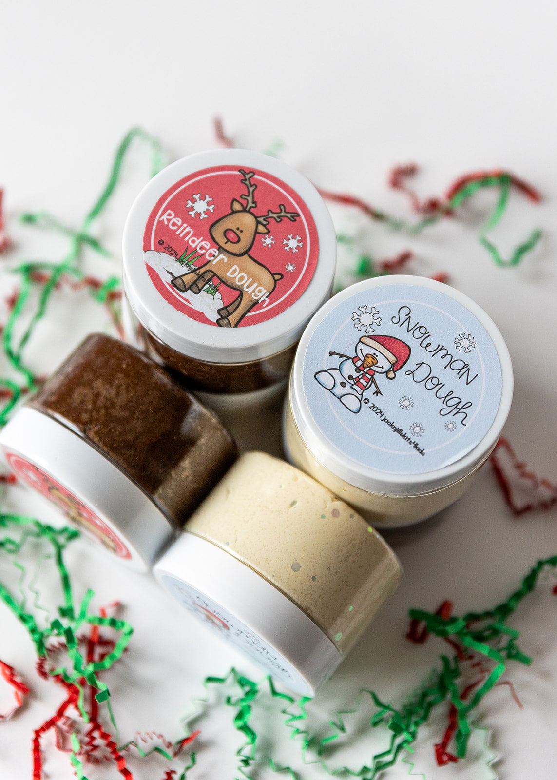 Your kids will have snow much fun with our new Build a Snowman Dough stocking stuffer! Our Snowman Dough comes in a 4oz. jar filled with homemade play dough and all the parts you need to create your own little snowman.